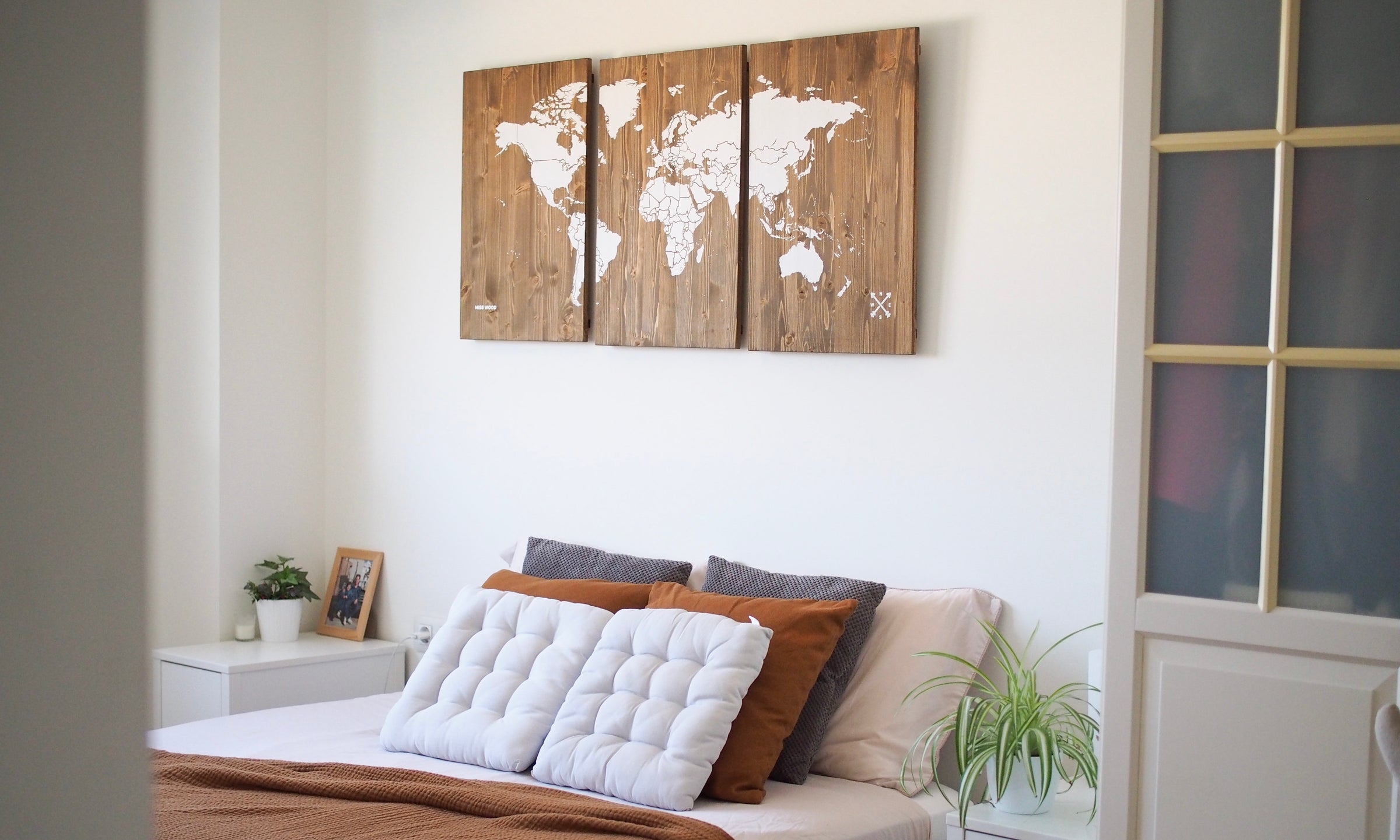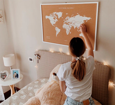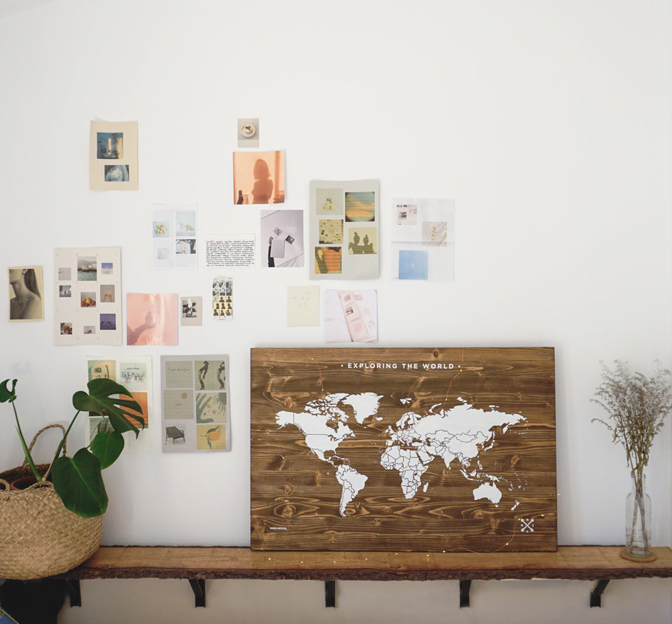 Mapas em cortiça, madeira, tecido ou papel. Pendure lembranças das suas viagens e experiências para manter viva a memória de tudo o que o faz feliz.