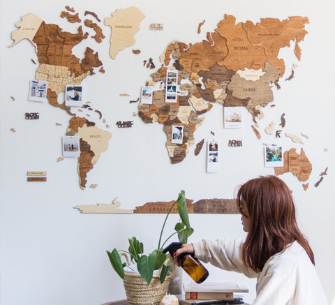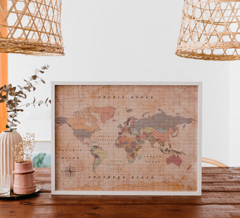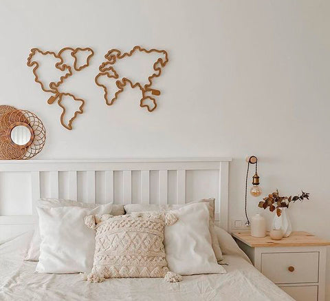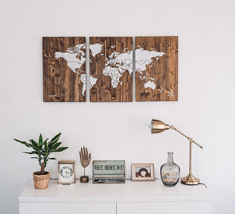 O estilo rústico cria um ambiente descontraído, confortável e tradicional que faz lembrar a natureza. A madeira é a chave para este tipo de decoração. Acrescente um mapa-mundo de madeira feito à mão para realçar o seu estilo e adornar as suas paredes.