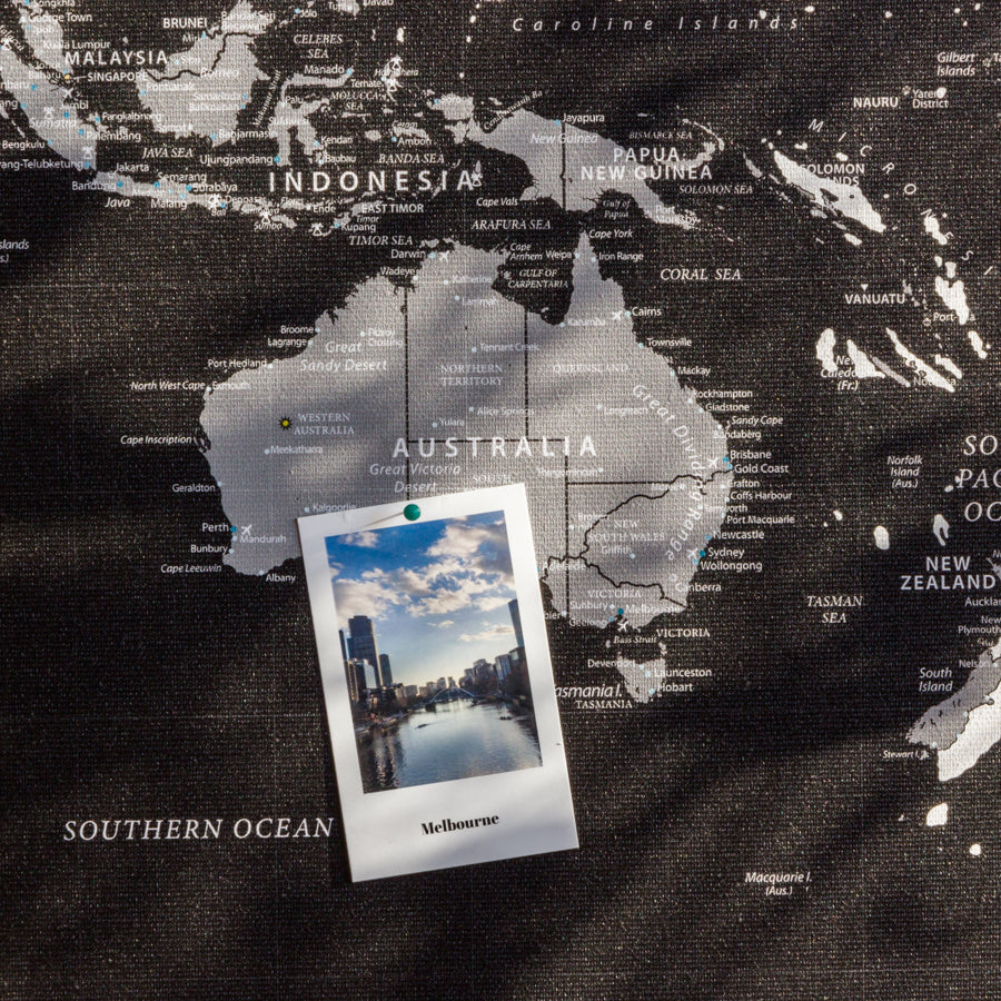 · Mapa-mundo de cortiça em preto: Ideal para espaços onde parte do mobiliário também é preto. É uma cor que dará muita elegância ao espaço onde o decidir colocar.