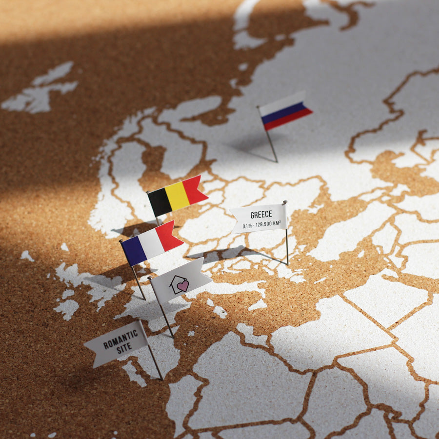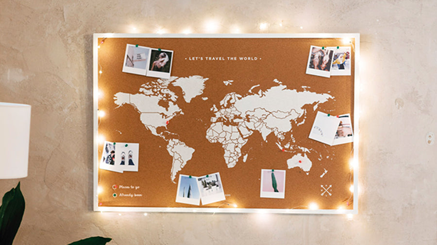 Um mapa do mundo em cortiça é uma ideia muito original para guardar as recordações das suas viagens e sonhar com as próximas. De todos os mapas existentes no mercado, o mapa em cortiça é sem dúvida o mais personalizável. Este material permite-lhe colar pinos de desenho, pendurar fotografias, bandeiras, bilhetes... O que quiser!