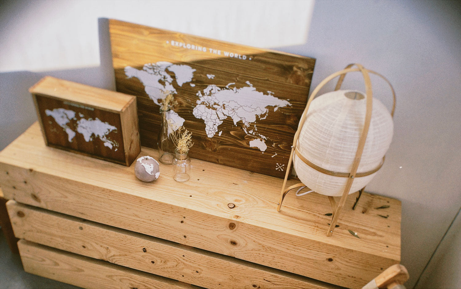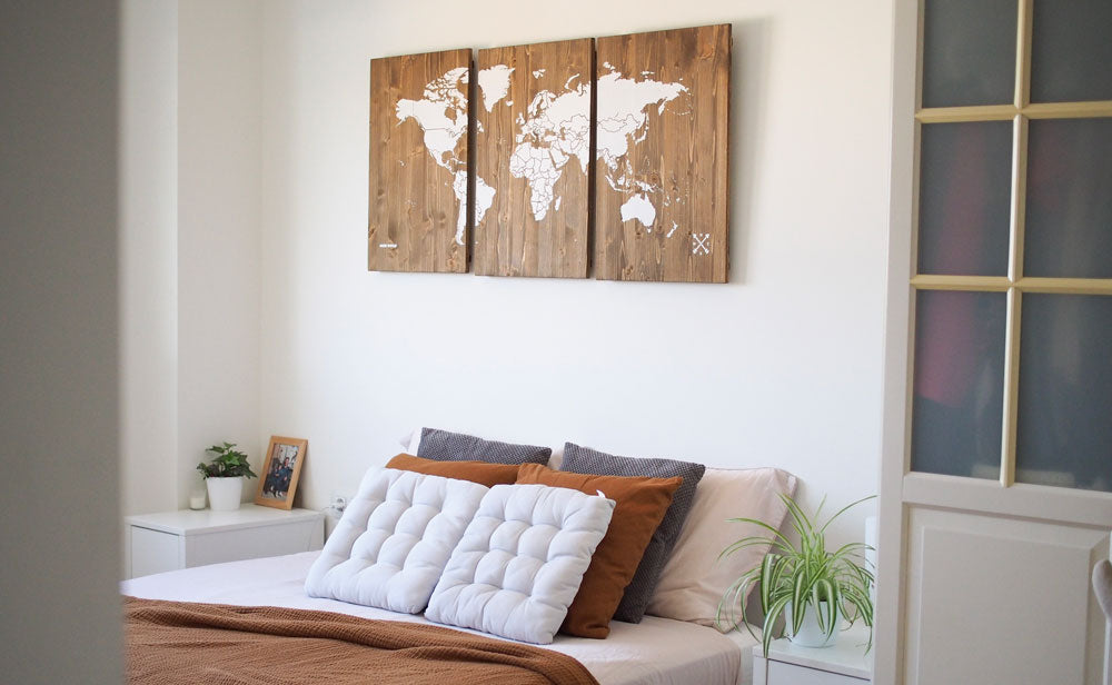 Todos os viajantes têm em casa algo que os identifica como os aventureiros que são: recordações das suas aventuras, guias de viagem... Este mapa-múndi artesanal em madeira é perfeito para oferecer a esse amigo viajante e decorar as paredes dos seus quartos.