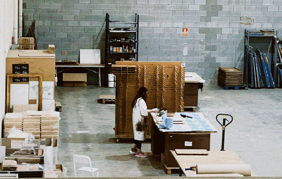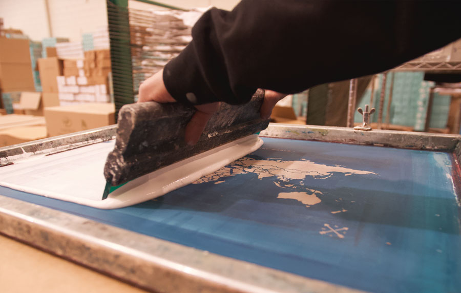 Utilizamos duas técnicas de impressão para os nossos cartazes de madeira. A serigrafia para a produção dos mapas do mundo, que consiste em transferir uma tinta através de uma malha esticada numa moldura. A impressão digital, que é mais comum para impressões personalizadas com um design único.
