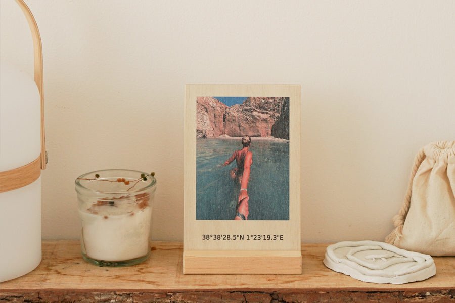The 10 × 15 cm photos printed on wood are the ideal size to place on our photo holder. The perfect idea to decorate shelves and cabinets with your most beautiful memories.