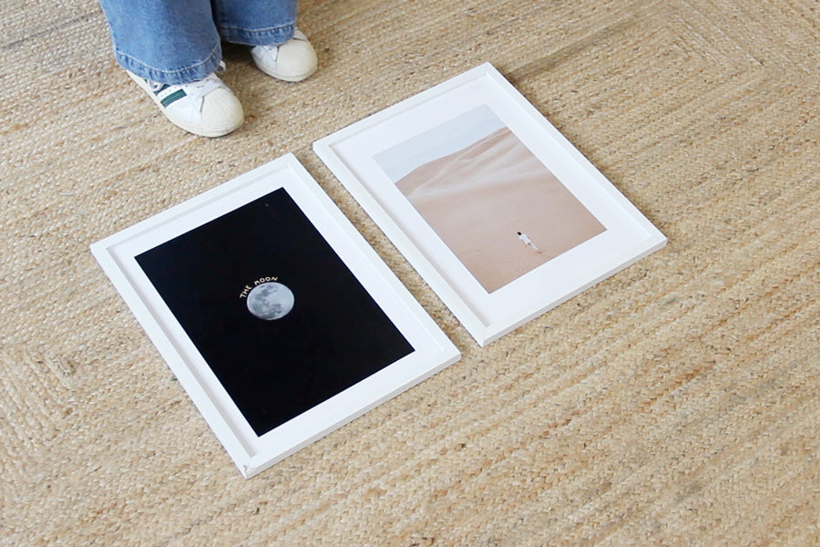 Coloque as suas fotografias no chão, em frente a uma parede vazia. Recomendo que utilize impressões ou fotografias de grande formato, pois ficará muito melhor do que se utilizar molduras pequenas.