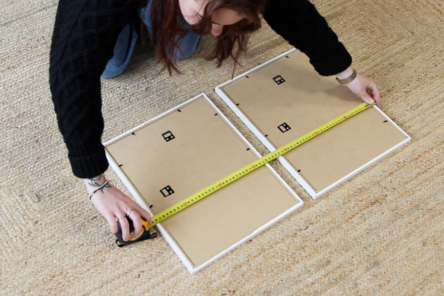Faça um esquema ou uma apresentação no chão, com os quadrados ao contrário, para que possa ver as tomadas ou os cabides. Recomendo que deixe um espaço mínimo de 5 ou 10 cm entre os dois quadros. Isso proporcionará uma harmonia visual e estética.