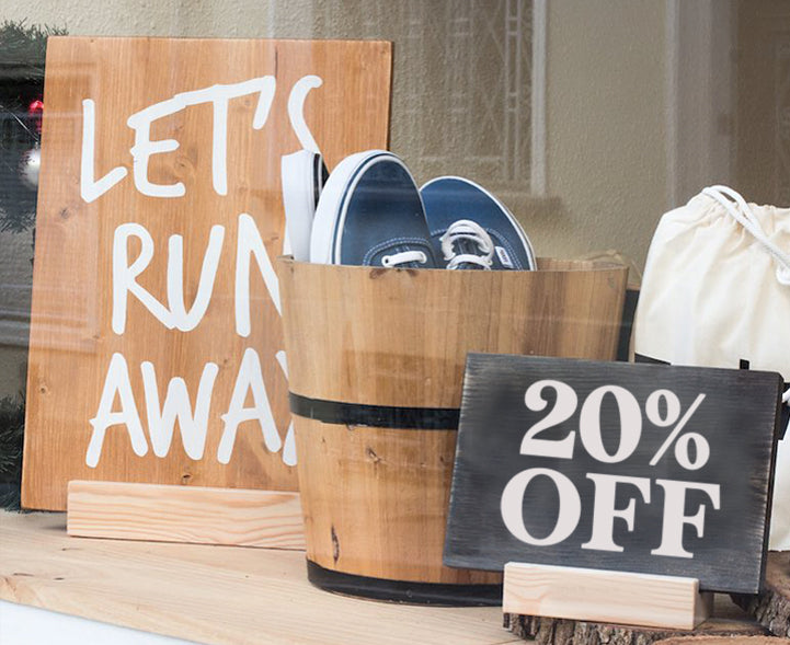 Deixe para trás os elegantes sinais de desconto e adicione uma peça decorativa de madeira para dar classe aos cantos do seu estabelecimento.