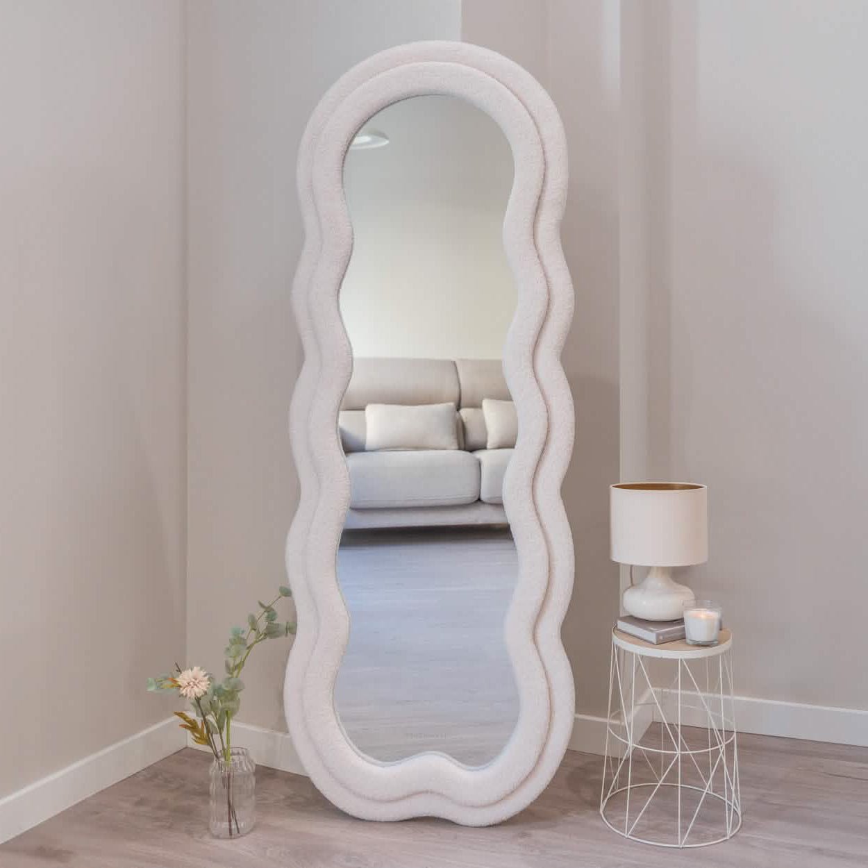 Dale personalidad y calidez a cualquier rincón con este espejo de diseño orgánico y textura suave. Su tejido teddy aporta un toque acogedor y en tendencia, perfecto para cualquier espacio. Puedes apoyarlo en el suelo o colgarlo fácilmente gracias a sus ganchos traseros.