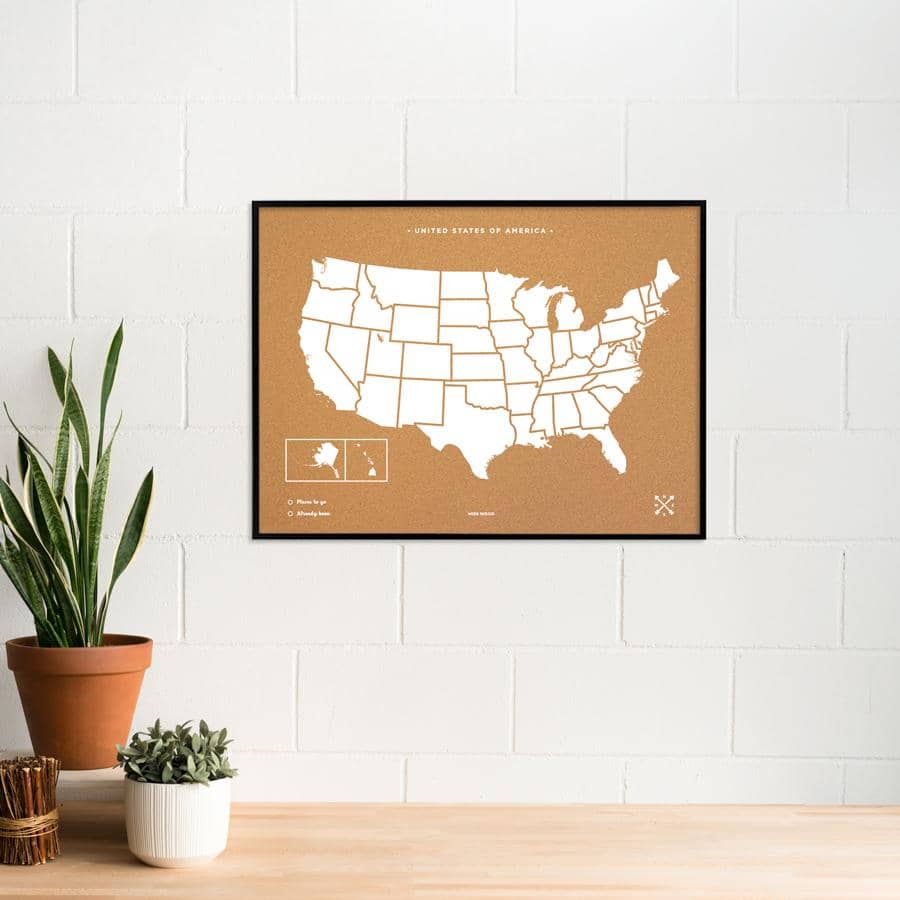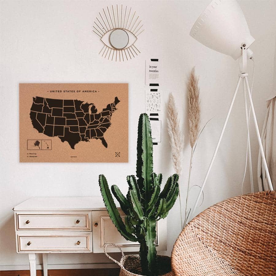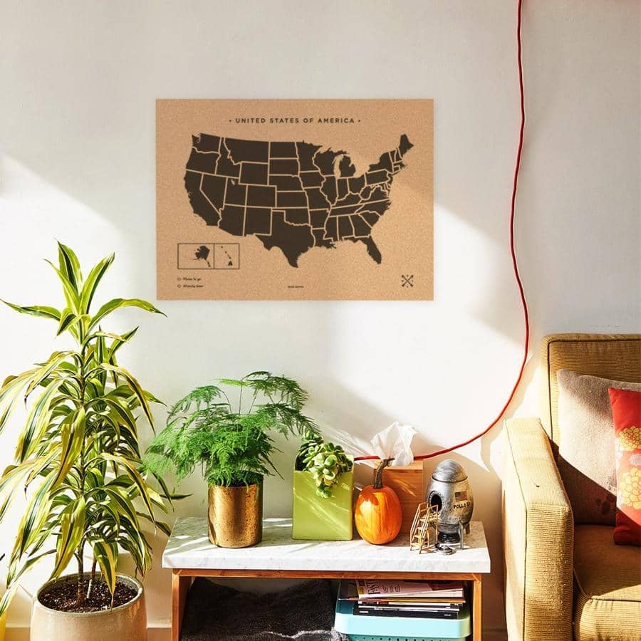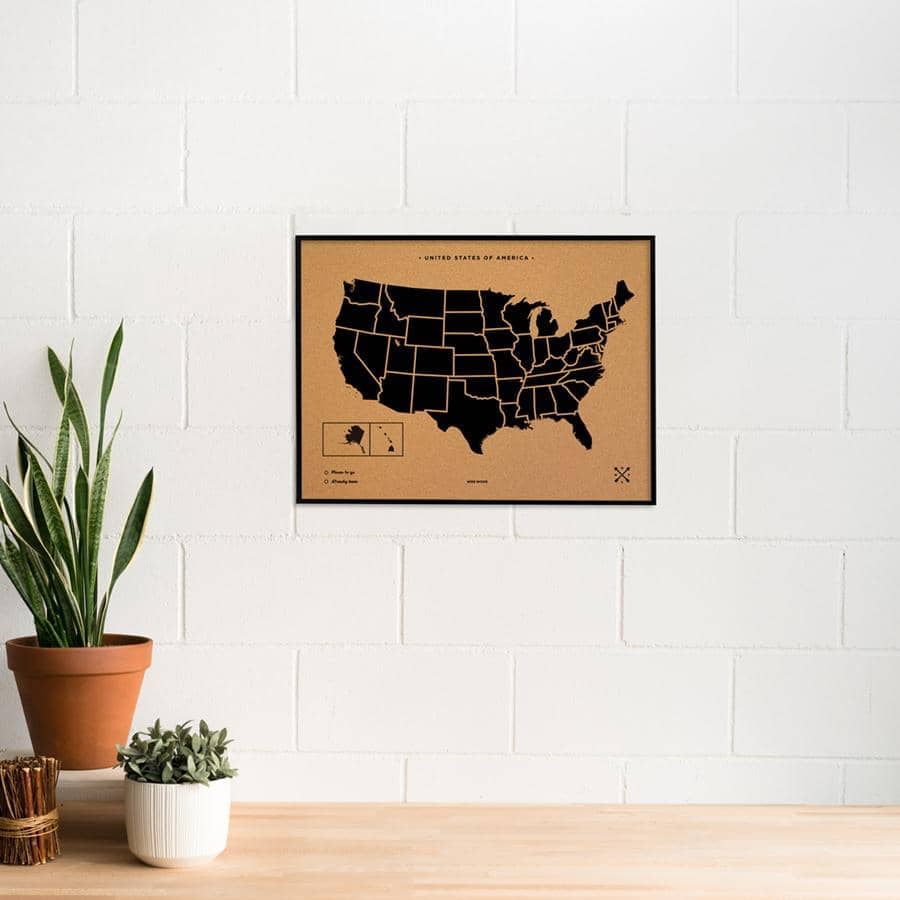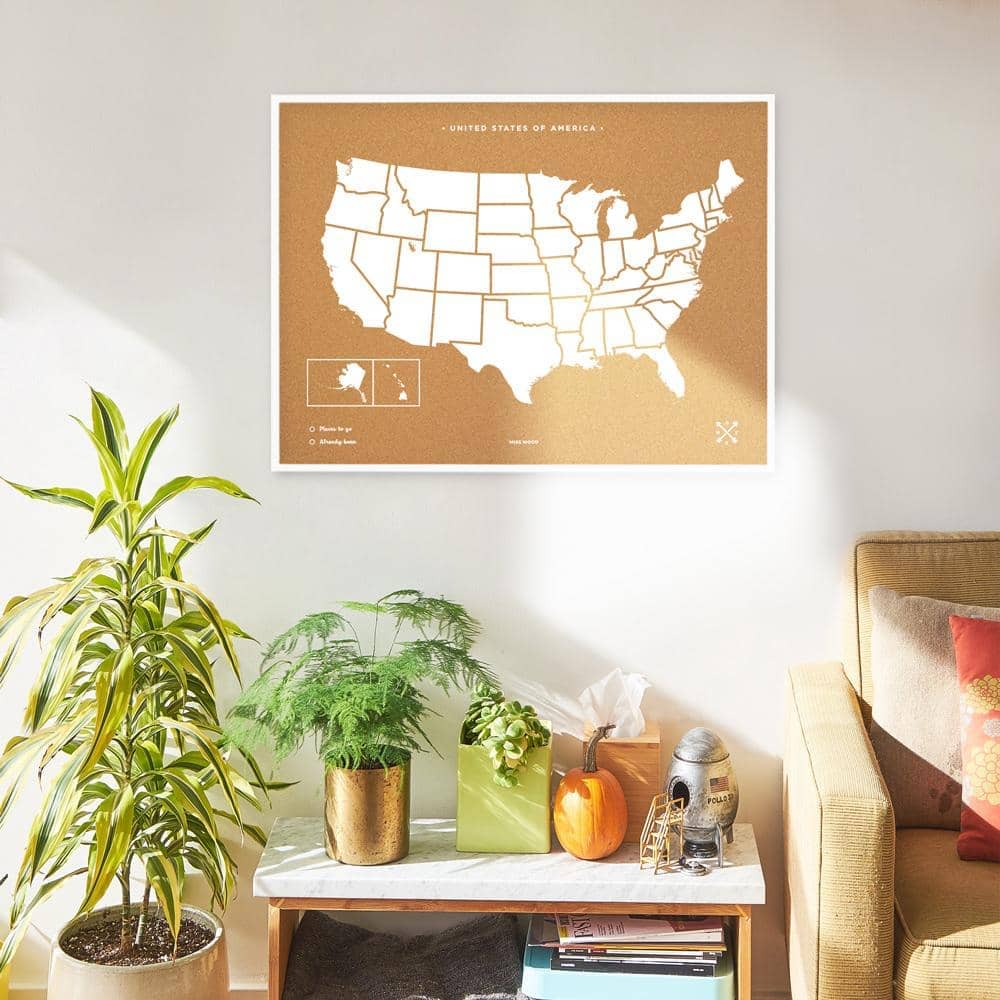 Decore as paredes da sua casa com um mapa dos Estados Unidos em cortiça. Escolha entre o branco e o preto para a moldura e o desenho e pense num local da sua casa onde o vai pendurar. Já o tem? Agora só falta clicar nos pinos incluídos no mapa e pendurar as suas fotografias de estilo vintage.